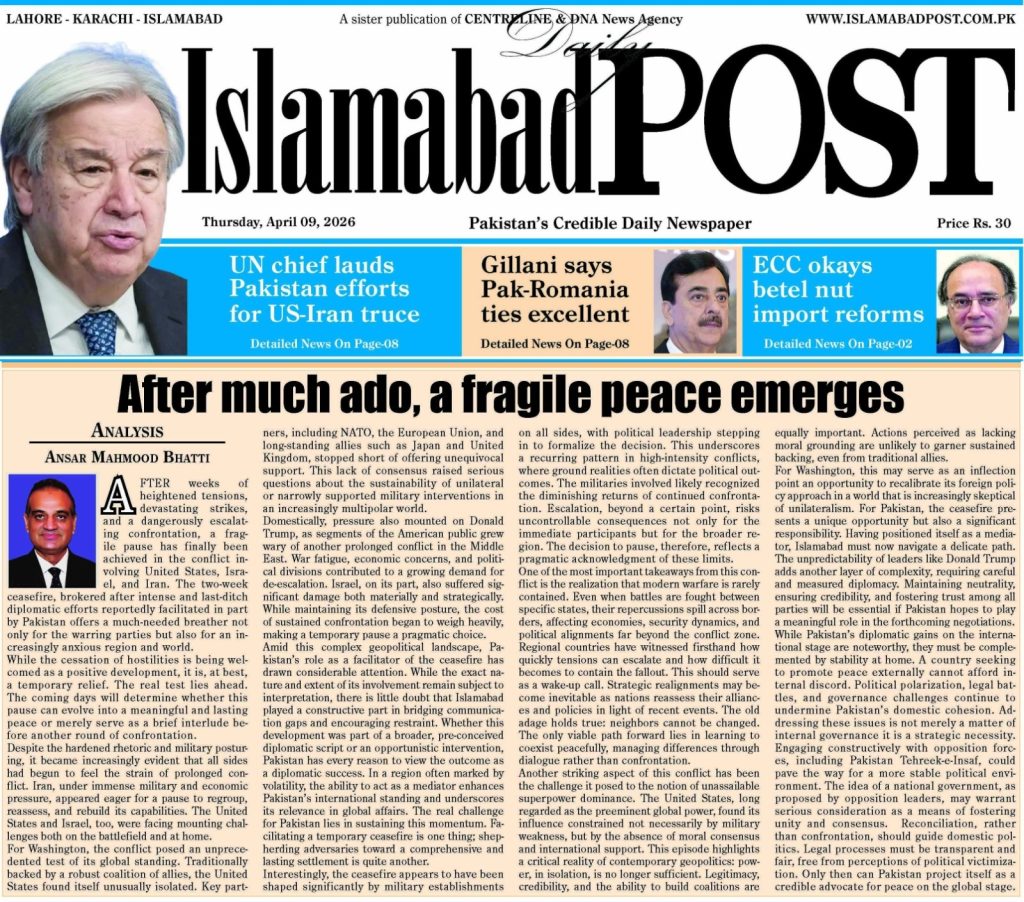 After weeks of heightened tensions, devastating strikes, and a dangerously escalating confrontation, a fragile pause has finally been achieved in the conflict involving United States, Israel, and Iran. The two-week ceasefire, brokered after intense and last-ditch diplomatic efforts reportedly facilitated in part by Pakistan offers a much-needed breather not only for the warring parties but also for an increasingly anxious region and world.