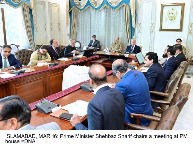 ISLAMABAD, MAR 16: Prime Minister Shehbaz Sharif chairs a meeting at PM house.=DNA