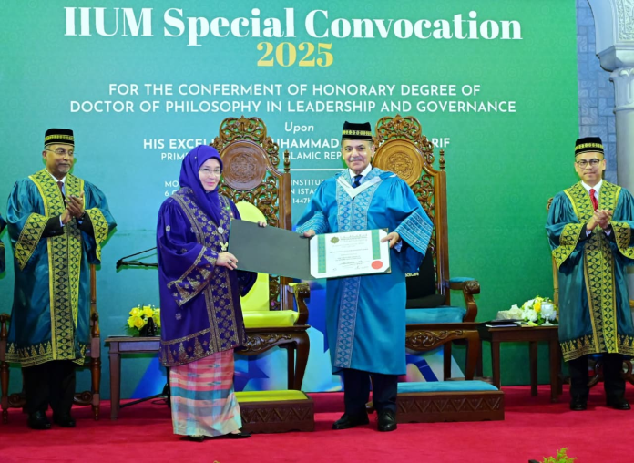 KUALA LUMPUR: The International Islamic University of Malaysia (IIUM) on Tuesday conferred an Honourary Degree of Doctor of Philosophy in Leadership and Governance on Prime Minister Muhammad Shehbaz Sharif in recognition of his outstanding leadership and contributions to nation-building.