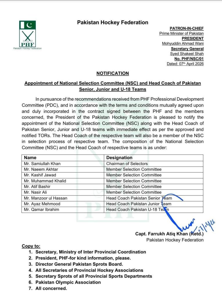 The notification, signed by Capt. Farrukh Atiq Khan (Retd.) on behalf of the federation, states that the appointments have been made under the authority of PHF President Mohyuddin Ahmad Wani. Copies of the notification have been sent to the Ministry of Inter Provincial Coordination, the Pakistan Sports Board, provincial hockey associations, and the Pakistan Olympic Association.