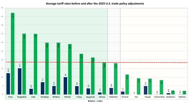 In early 2025, the United States introduced a new trade policy imposing a 10% baseline tariff on imports from all non-exempt countries, with higher rates for selected partners. For Uzbekistan, which falls under the baseline rate, the average U.S. tariff rose sharply—from 3.8% in 2024 to 18.1% in 2025. This escalation, especially in fuels and mining (29.5%) and manufacturing (14.5%), tightens market access for Uzbek exporters and could reduce competitiveness of low-margin products. Nonetheless, the tariff pattern also presents selective opportunities: moderate duties on processed foods, textiles, and industrial intermediates provide niches that could be expanded through improved certification, logistics, and trade facilitation. Regionally, Uzbekistan now occupies a middle position, facing higher tariffs than Kazakhstan but much lower than large Asian exporters like China and India, offering potential to serve as a tariff-neutral hub for re-export and light manufacturing aimed at the U.S. market. These shifts have important implications for Uzbekistan’s market positioning and sectoral competitiveness.